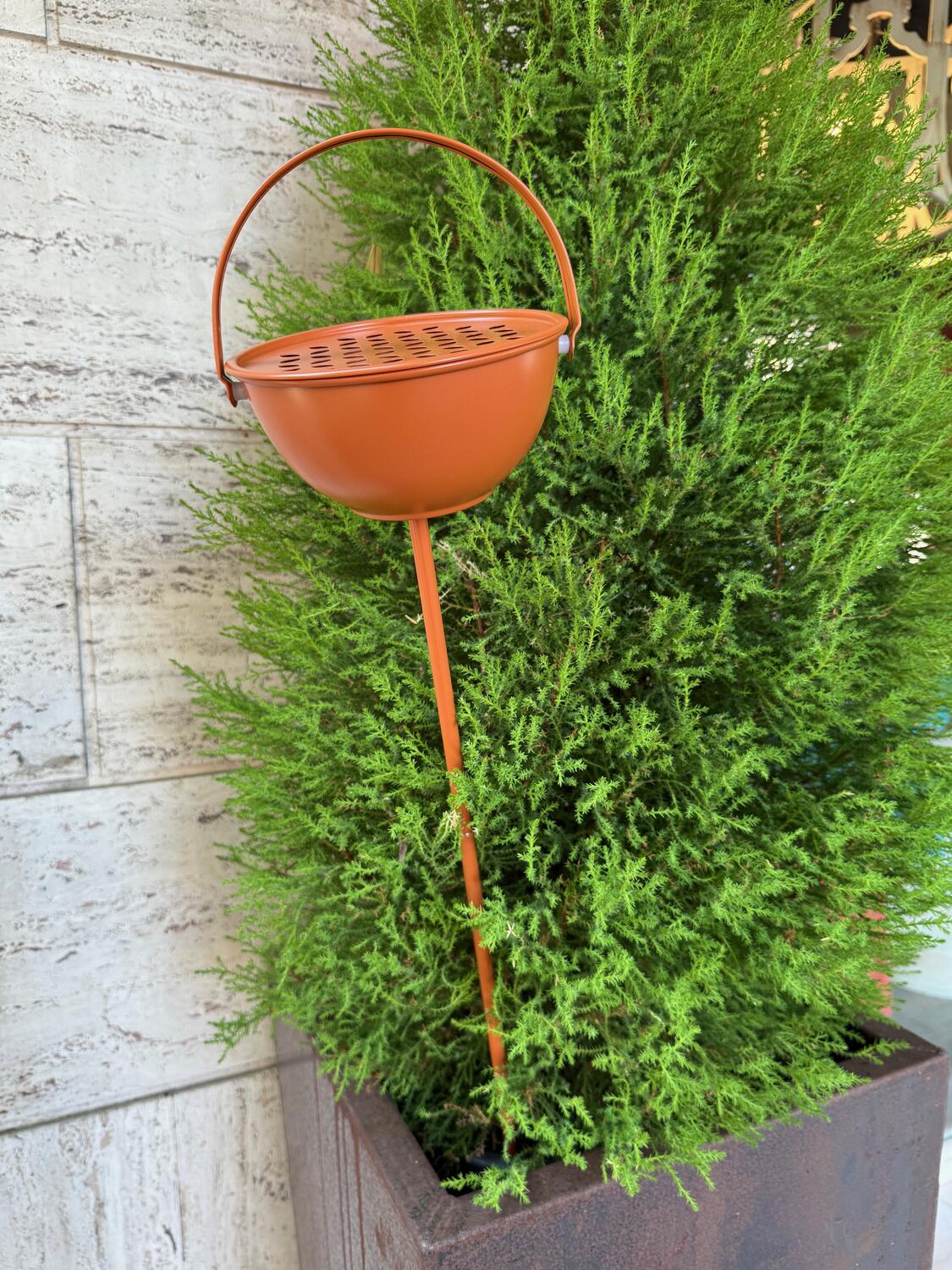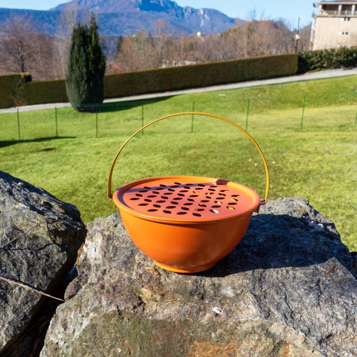 Porta zampironi in metallo. Dotato di griglia con pattern decorativo, utilizzabile da tavolo con manico pieghevole oppure con stelo (modulabile in altezza) da inserire nel terreno in giardino o in un vaso per posizionarlo ovunque tu voglia.
